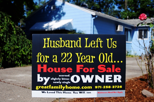 Стоимость GPS отслеживателя 250 долларов, камеры с оптической линзой Nikon Zoom — 1600 долларов. Поймать своего мужа во время измены и оплатить за этот баннер с нашего общего счета — бесценно.
