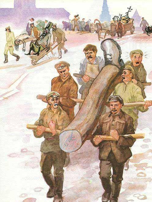 Рабочие во главе с Лениным несут огромный деревянный протез ноги