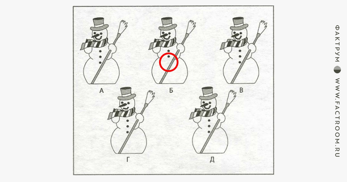 1. Многие люди говорят, что лишний снеговик Б. Действительно, у него только две пуговки, тогда как у остальных снеговиков их три. Но не стоит спешить с выводом.