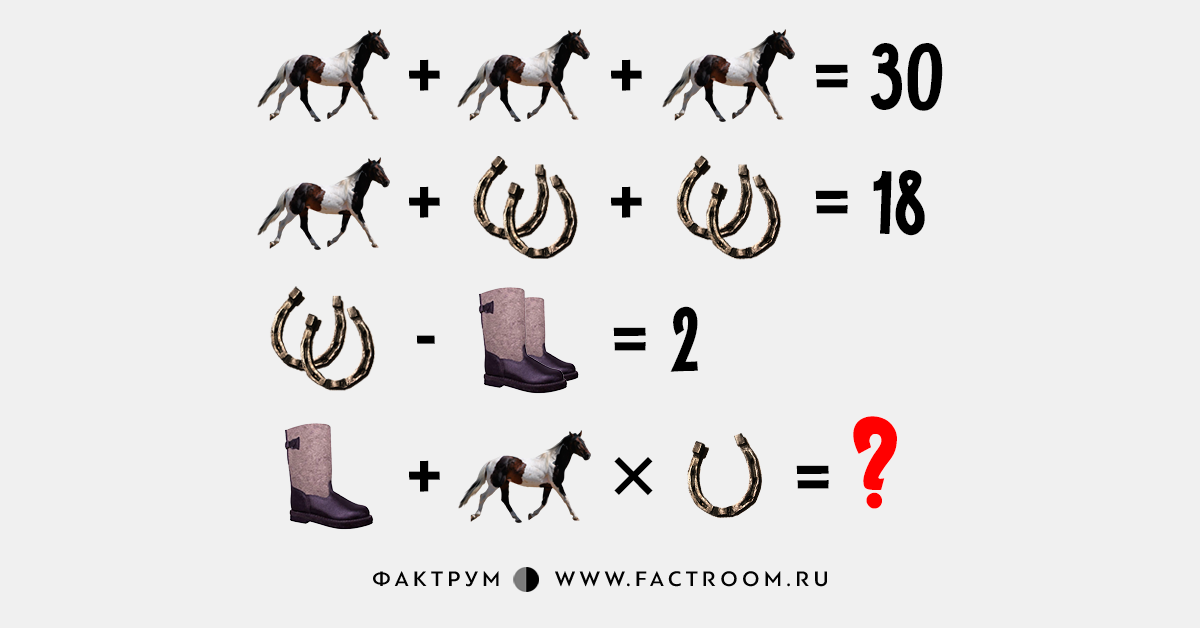 Перед вами математические примеры, где вместо цифр использованы подковы, лошади и сапоги. Постарайтесь найти закономерность в уже известных ответах и назовите цифру, являющуюся решением для последнего примера.