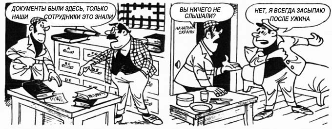 Архив находился в подвале, а секретные документы были подготовлены к переносу в другое помещение и лежали в портфеле. Именно этот портфель и похитил злоумышленник ночью. Детектив первым делом направился к охраннику, но тот сознался, что постоянно спит после ужина.