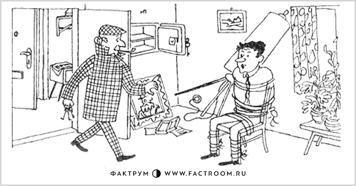 — О, детектив, как хорошо, что вы пришли. Пожалуйста, поскорее развяжите эти проклятые верёвки, я так измучен! Этой ночью к нам в квартиру ворвался мужчина, привязал меня к стулу и украл все драгоценности моей любимой супруги! Конечно же, они застрахованы, но я бы очень хотел, чтобы вы поймали грабителя до возвращения моей жены. Она вот-вот должна вернуться из командировки.