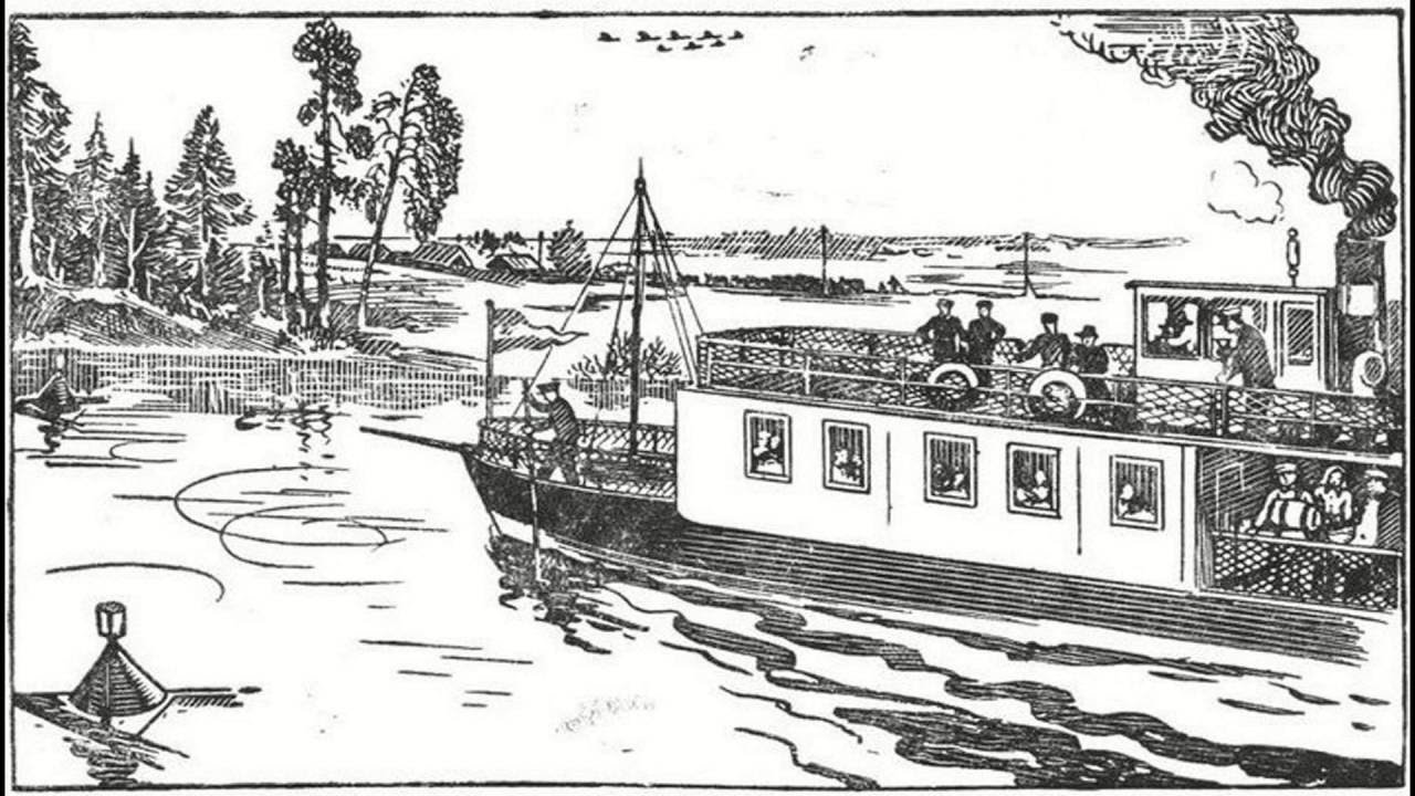 - Очевидно, пароход причаливает к пристани: группа пассажиров, взяв вещи, приготовилась сойти с парохода.