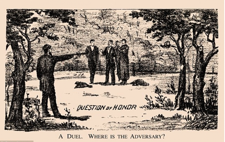 На этом изображении чётко видно мужчину с пистолетом и секундантов, стоящих в центре. Но где же второй участник поединка?