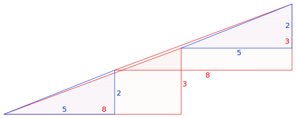 А в треугольнике площади разноцветных фигур не изменяются, но вот гипотенуза главного треугольника немного неровная — в первом случае она немного выгнута, а во втором — наоборот, искривлена наружу, и это незаметно на первый взгляд. Именно за счёт такого искривления и возникает «лишний» квадратик.
