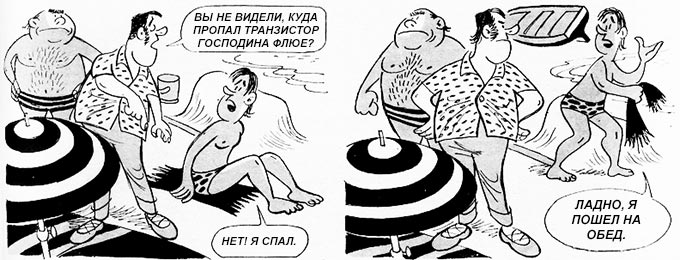 Устав лежать, господин Флюе отправился поплавать, а когда вернулся, то увидел, что его радиоприёмник пропал. К счастью, в это время детектив пришёл на пляж. Он тут же решил разобраться в произошедшем.