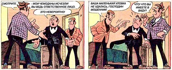 Детектив обратил внимание разные размеры чемоданов. Очевидно, что мошенник, выходя из номера вечером, сложил их друг в друга и убрал в самый большой чемодан, а потом вынес из гостиницы. Тем более, что «месье Дюпон» отказался от помощи администратора, чтобы тот не заметил, что его чемоданы на самом деле пусты.