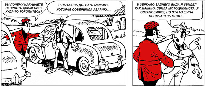 Однажды летним днём детектив ехал по своем делам и вдруг заметил мужчину, стоящего рядом с покорёженным мотоциклом. Детектив остановился и поспешил на помощь пострадавшему, расспросив его о случившемся.