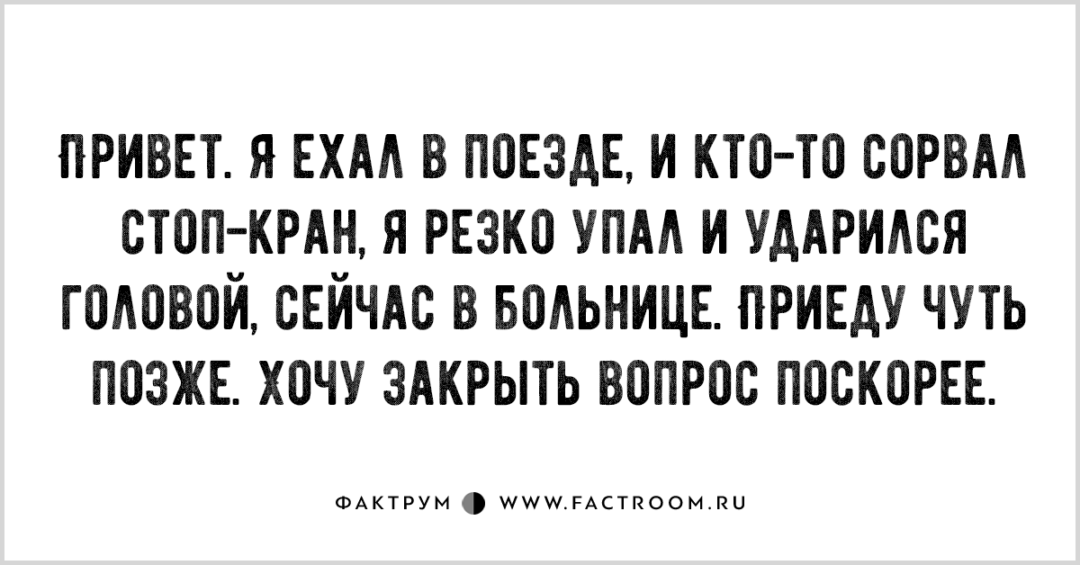 Привет. Я ехал в поезде, и кто-то сорвал стоп-кран, я резко упал и ударился головой, сейчас в больнице. Приеду чуть позже. Хочу закрыть вопрос поскорее.