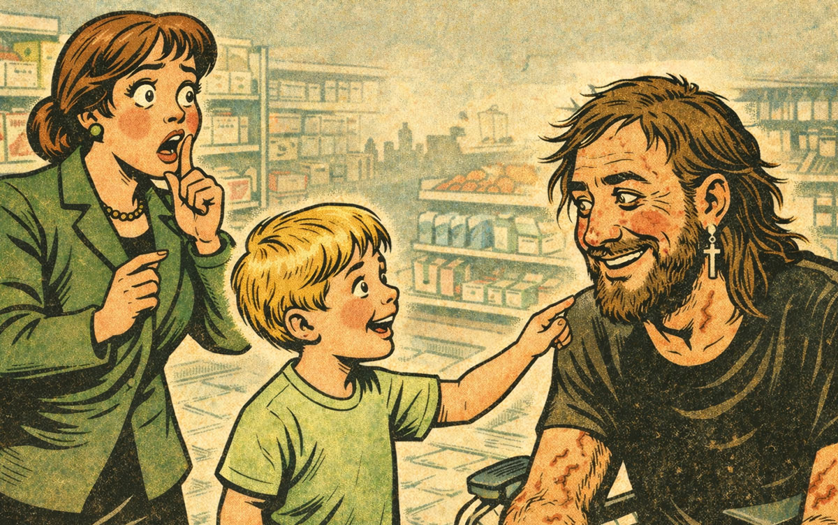 Несколько лет назад мы с 6-летним сыном пошли за покупками в супермаркет. Там я заметила молодого, длинноволосого и бородатого мужчину в инвалидной коляске. Должно быть, он пережил какую-то страшную аварию, потому что у него не было обеих ног, а лицо покрывали шрамы. Когда сын тоже его увидел, он громко крикнул: