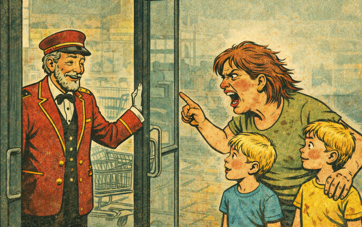 Примерно через два часа после начала моего первого рабочего дня в магазин вошла очень крикливая, отталкивающего вида злобная женщина с двумя своими детьми, непрестанно бранящаяся в их адрес. В соответствии с учебным руководством для швейцаров, я любезно произнес: «Доброе утро и добро пожаловать! У вас прелестные дети. Они близнецы?»