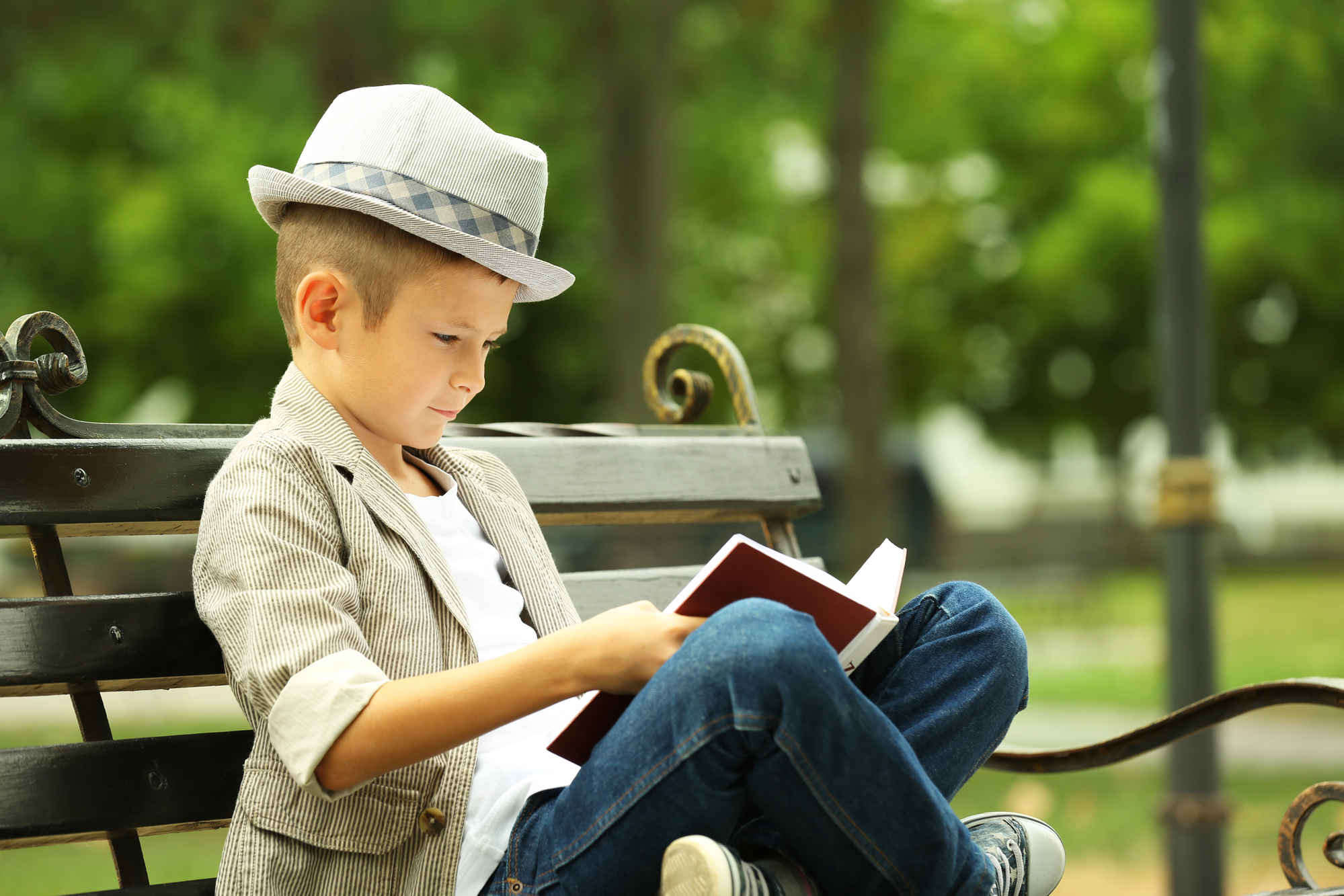 Парк, скамейка, совсем ещё маленький мальчик читает книгу о науке…