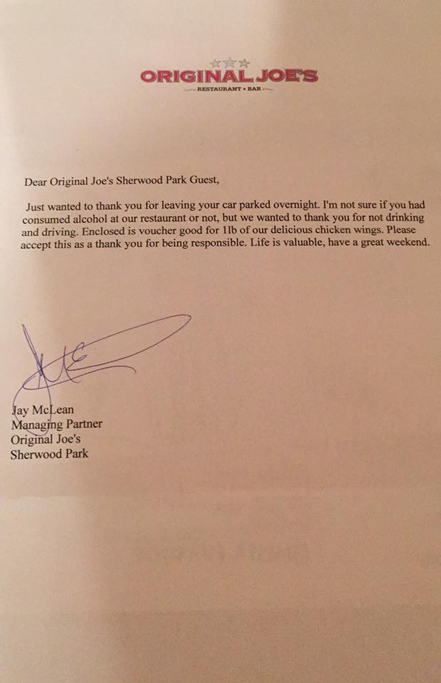 Мы сердечно благодарим вас за то, что вы оставили свой автомобиль на нашей парковке на всю ночь. И мы невероятно признательны вам, что вы не стали рисковать и садиться за руль в нетрезвом состоянии. Позвольте в знак нашего безмерного уважения к вашему ответственному социальному поведению вручить вам сертификат на полкилограмма наших фирменных куриных крылышек. Любите свою жизнь и хороших вам выходных»