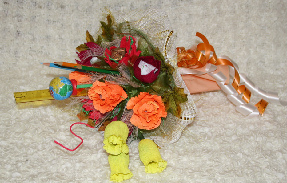 Традиционный презент на учительский праздник — букет. Впрочем, для него необязательно покупать розы, герберы или гладиолусы. Ведь его можно составить из, казалось бы, совсем не подходящих для этого предметов. Например, из: