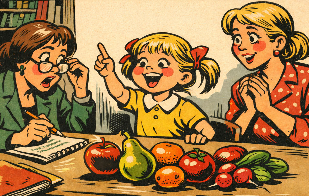 — Начнём с самого простого, — сказала психолог и выложила из вазы на стол восковые фрукты. — Яблоко, груша, апельсин, абрикос. Как всё это можно назвать одним словом?