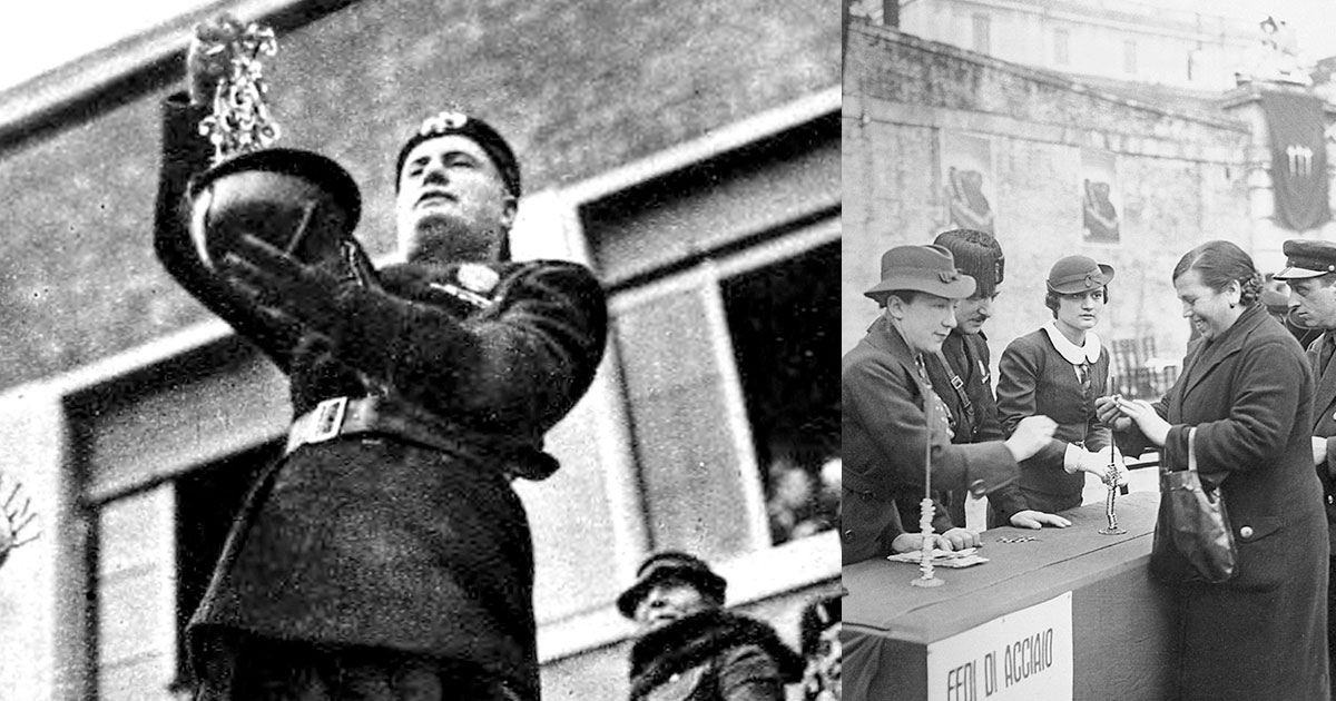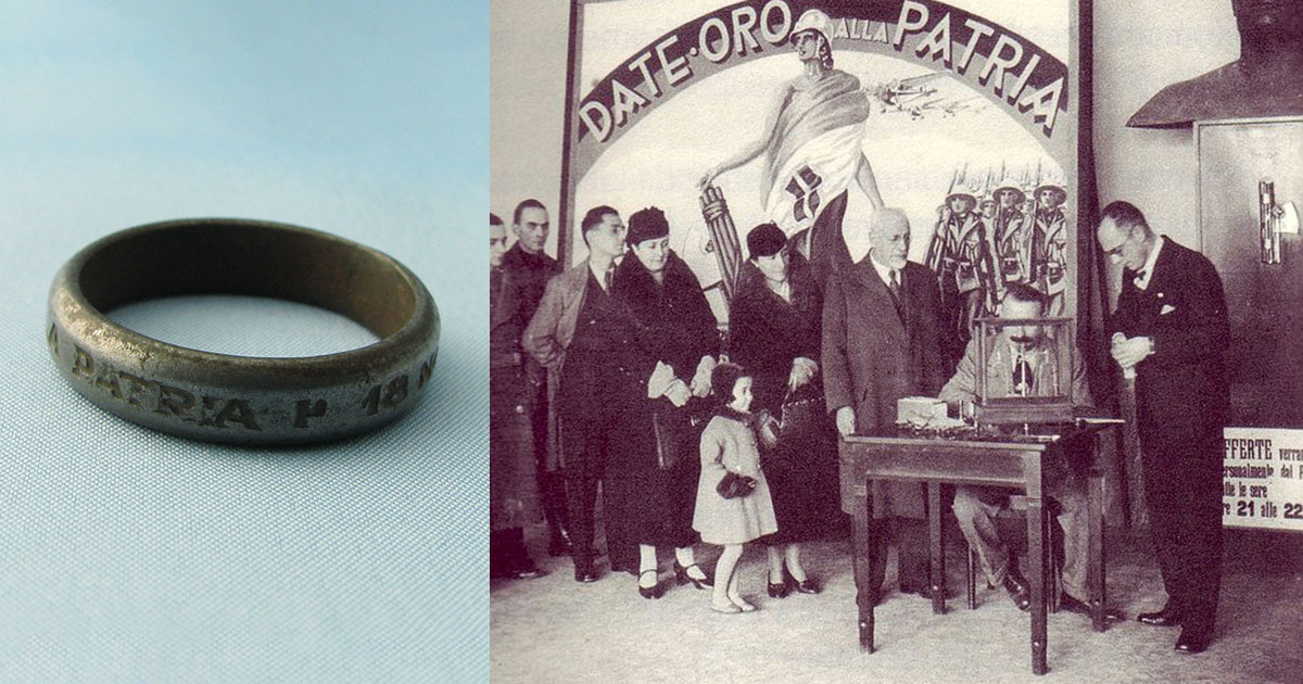 Кульминацией стала масштабная кампания «Золото для родины»: на площадях Рима и других городов открыли пункты сбора, куда люди несли обручальные кольца и семейные драгоценности, получая взамен простые железные. Сам Муссолини с семьёй демонстративно сдал все украшения, а лауреат Нобелевской премии Луиджи Пиранделло — даже свою медаль, превратив акцию в символ всеобщей жертвы ради государства.