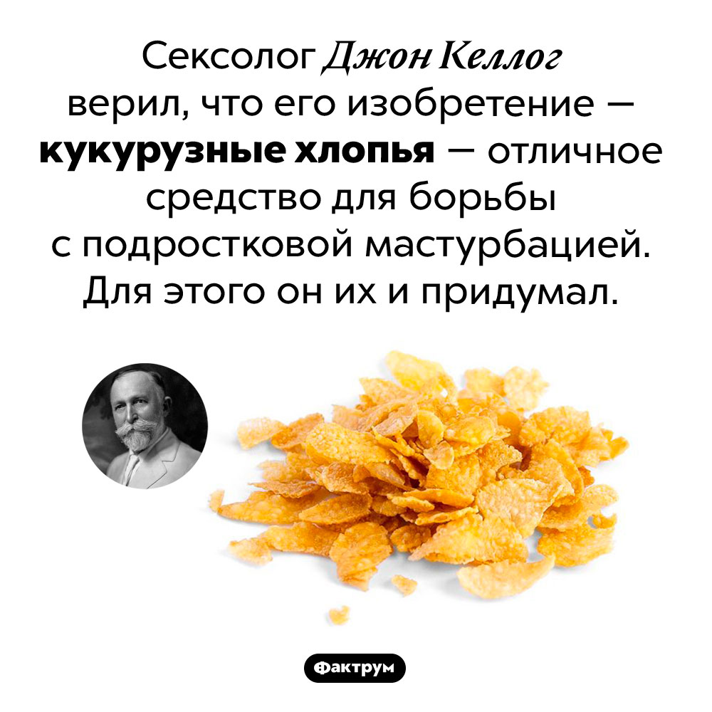 Сексолог Джон Келлог верил, что его изобретение — кукурузные хлопья — отличное средство для борьбы с подростковой мастурбацией. Для этого он их и придумал.