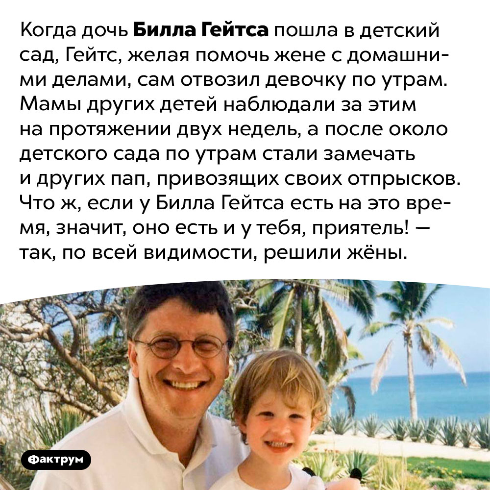 Когда дочь Билла Гейтса пошла в детский сад, Гейтс, желая помочь жене с домашними делами, сам отвозил девочку по утрам. Мамы других детей наблюдали за этим на протяжении двух недель, а после около детского сада по утрам стали замечать и других пап, привозящих своих отпрысков. Что ж, если у Билла Гейтса есть на это время, значит, оно есть и у тебя, приятель! — так, по всей видимости, решили жёны.