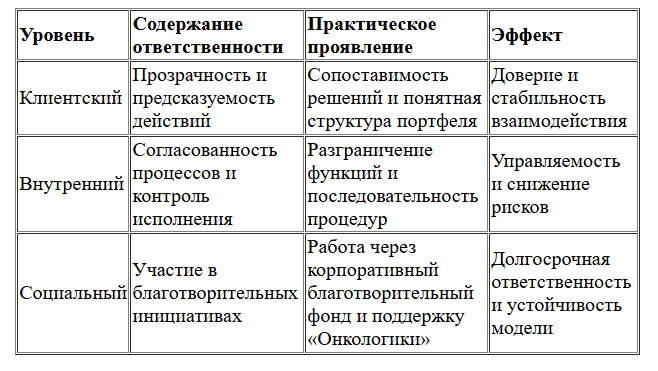 Третий уровень выходит за пределы инвестиционной деятельности и затрагивает социальную сферу. Участие в работе корпоративного благотворительного фонда и поддержка фонда «Онкологика» отражают расширенное понимание ответственности, в котором внимание уделяется не только финансовым результатам.