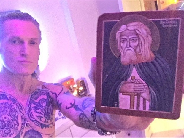 «Это мой домашний храм на Рублёвке, каждый вечер я включаю прожекторы, а свечи у меня горят целый день: и поминальные, и во здравие. На полу — это не секс-игрушки (они у меня тоже есть, но спрятаны в отдельном местечке), это каменные фаллосы с Урала, ведическо-православный алтарь прямо на дому, моё „место моления“. Это символ плодородия, мужского начала, символ жизни, и в этом нет ничего постыдного, я оккультист!