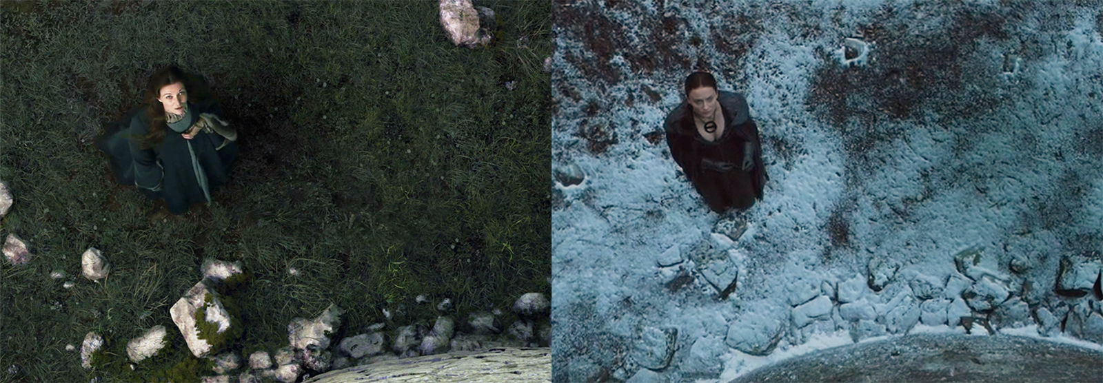 56. То, как Санса в Винтерфелле смотрит на Разрушенную башню от ее подножия, напоминает о такой же сцене в первом сезоне с участием Кейтилин после падения Брана.