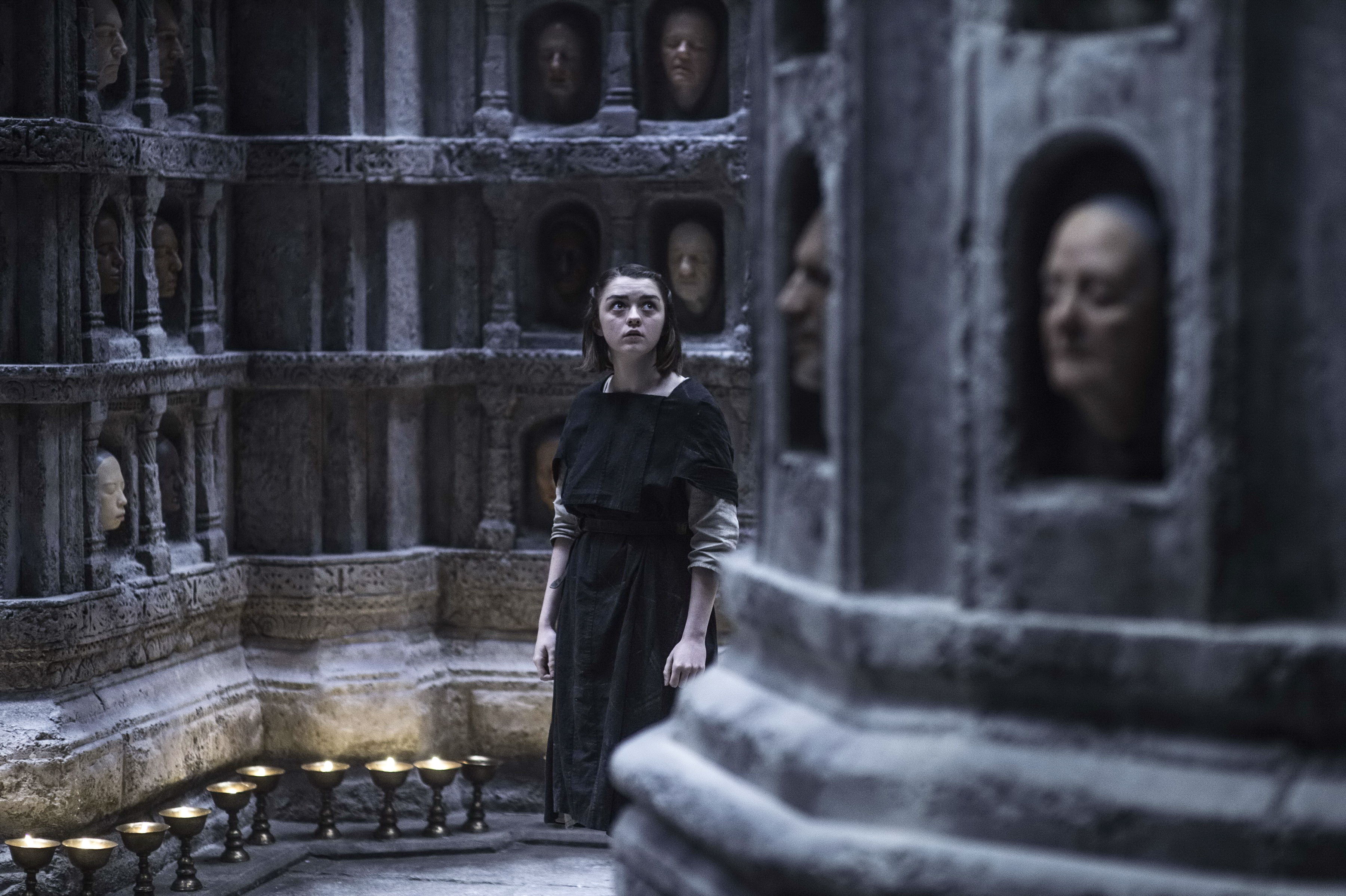 66. Лица на стенах зала лиц в Черно-Белом Доме принадлежат членам съемочной группы. Там среди прочих есть лица создателей сериала Дэвида и Дэна, продюсера Криса Ньюмана, каждое лицо для массовости повторяется несколько раз с разным оттенком кожи. Лицо женщины, которого Арья касается при первом своем посещении зала, принадлежит матери создателя реквизита Барри Каддела, занимавшегося изготовлением бутафорских лиц.