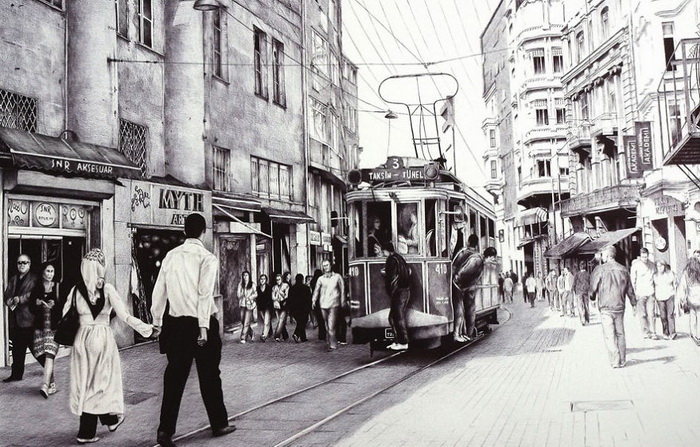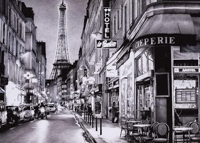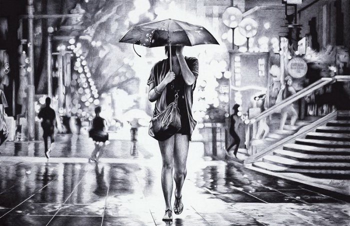 Урбанистика — тема, которая вдохновляет Андрея. Он запечатлевает различные моменты из повседневной городской жизни: пустынные улицы и многолюдные проспекты, прогулки под дождем и солнечные пейзажи. На создание каждой работы мастеру требуется от 200 до 300 часов.