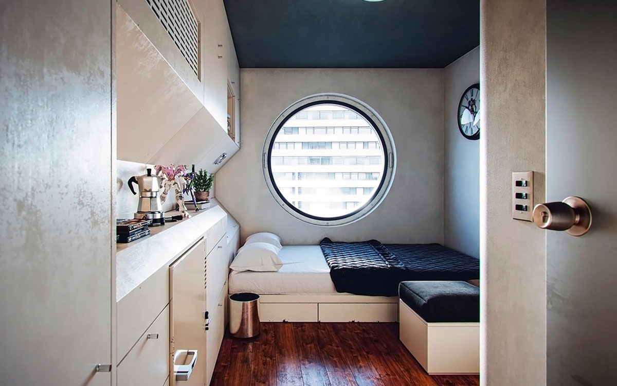 В 1972 году в Токио было построено первое в мире жилое капсульное здание — знаменитая «Башня Накагин» архитектора Кисё Курокава. 140 модульных капсул размером 2,5×2,5×4 м собирали на заводе и крепили к каркасу четырьмя болтами. В каждой находились всё необходимое для жизни: кровать, стол, ванная с туалетом, кондиционер, телевизор и телефон.