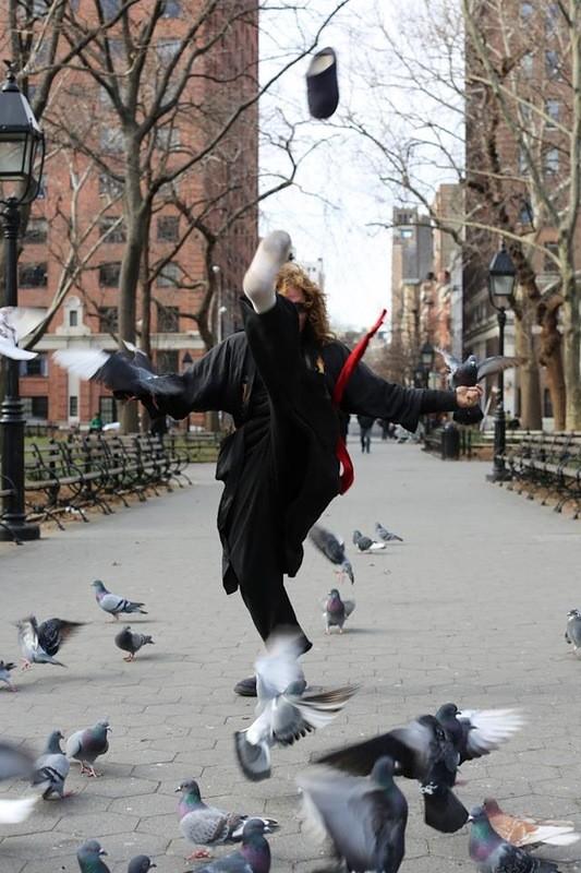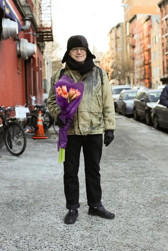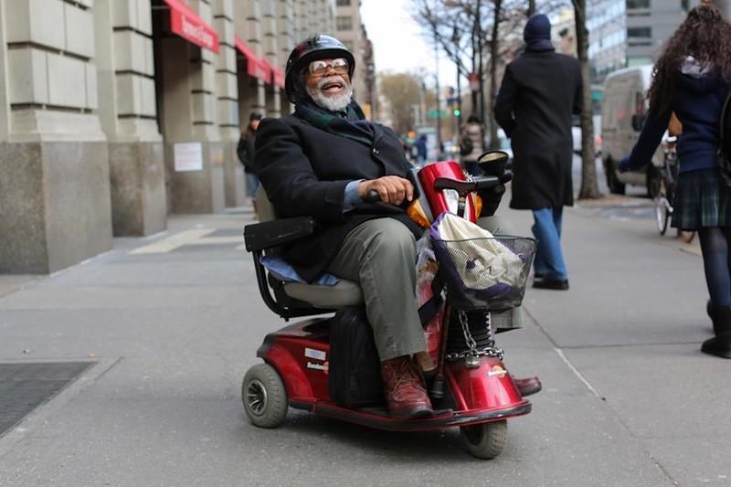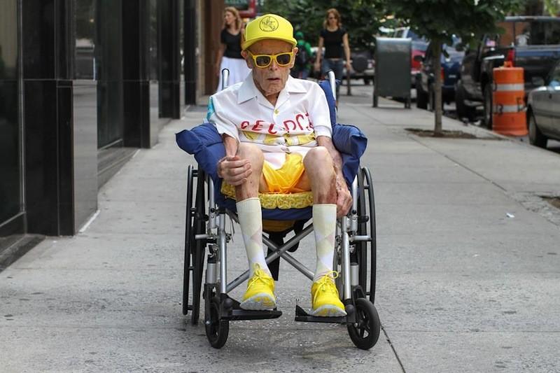 9. Вчера я наткнулся на национальное сокровище. Я шел по 3-й авеню, когда заметил старика в инвалидной коляске. Его везли опекуны. Несмотря на свое физическое состояние, он был одет крайне вызывающе. На нем был диковинный желтый костюм. Все у него было желтое, даже носки. Заинтересовавшись его внешностью, я наклонился к нему и попросил разрешения сфотографировать его. Он молча утвердительно кивнул.