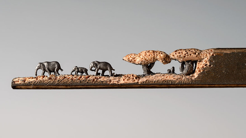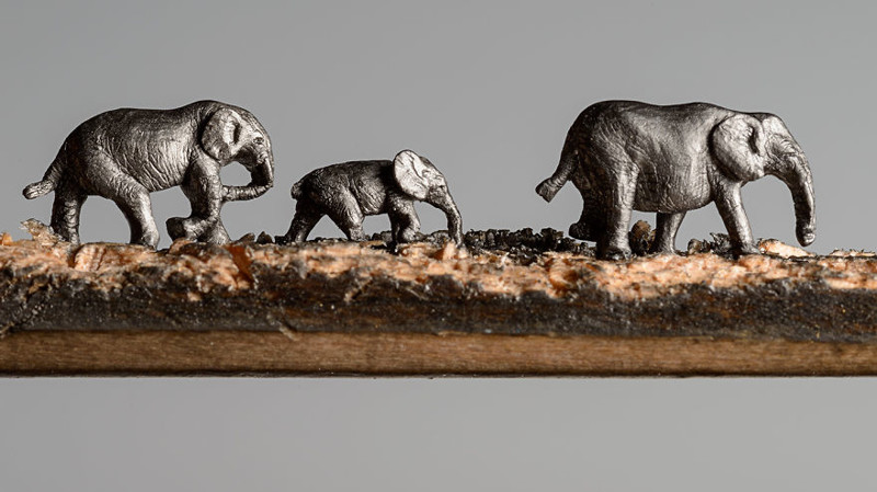 Каждый слон вырезан из отдельного карандаша. Лишь потом художница свела фигуры воедино