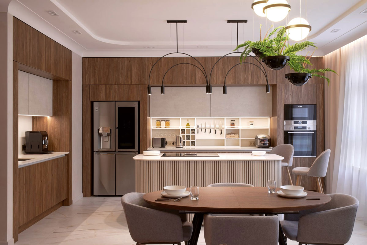 На среднем уровне разместите акцентное и функциональное освещение. Выделите ниши, картины, зеркала, повесьте лампу над обеденным столом или кухонным островом. Это поможет зонировать пространство и расставить акценты.