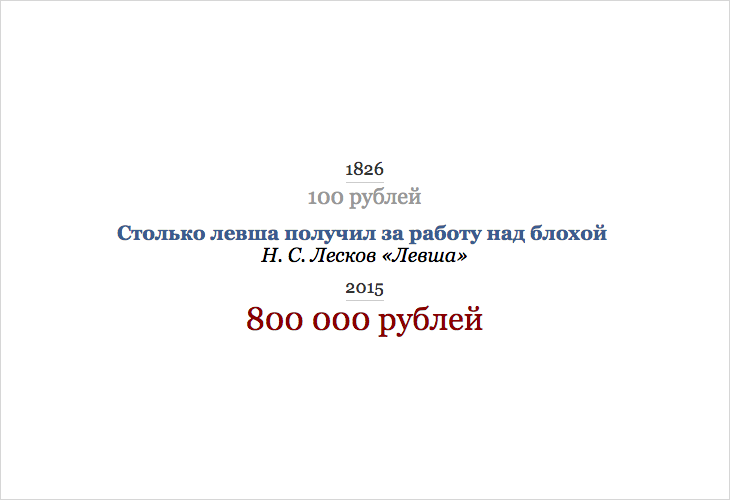 3. 100 рублей позволили бы левше, кабы не его лондонский загул, не работать дома 3–4 года, сохраняя привычные траты. В пересчете на среднюю зарплату в Туле в 2014 году — порядка 25 тыс. руб.- на руки левша получил от Платова за подковку блохи примерно 800 тыс. руб. текущими рублями.