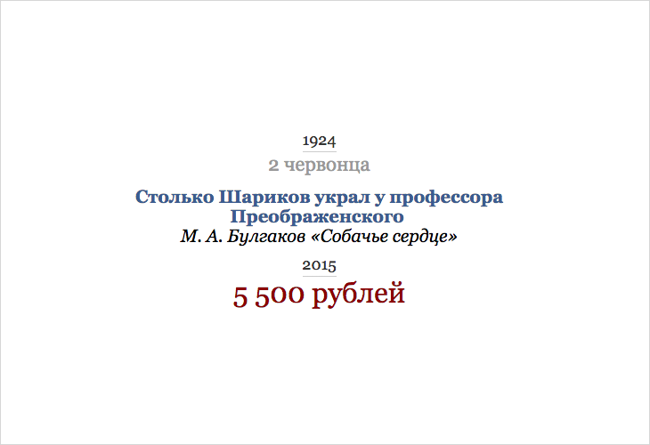 9. Минимальная цена водки (а Шариков с друзьями, безусловно, употребляли самую дешевую) в 2015 г. составляет 185 руб. за поллитровку. Таким образом, сейчас на те же цели без пяти минут сотрудник подотдела очистки коммунхоза на застолье, стоившее в 1924 году два червонца, потратил бы порядка 5,5 тыс. руб.