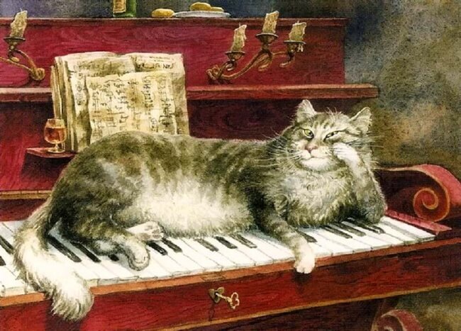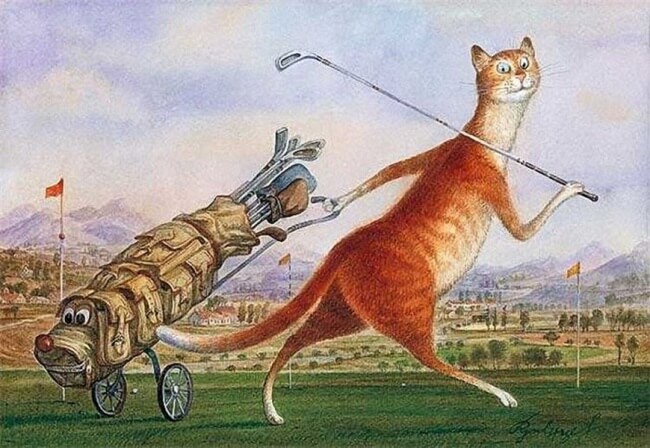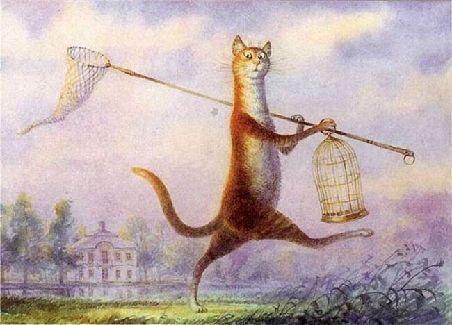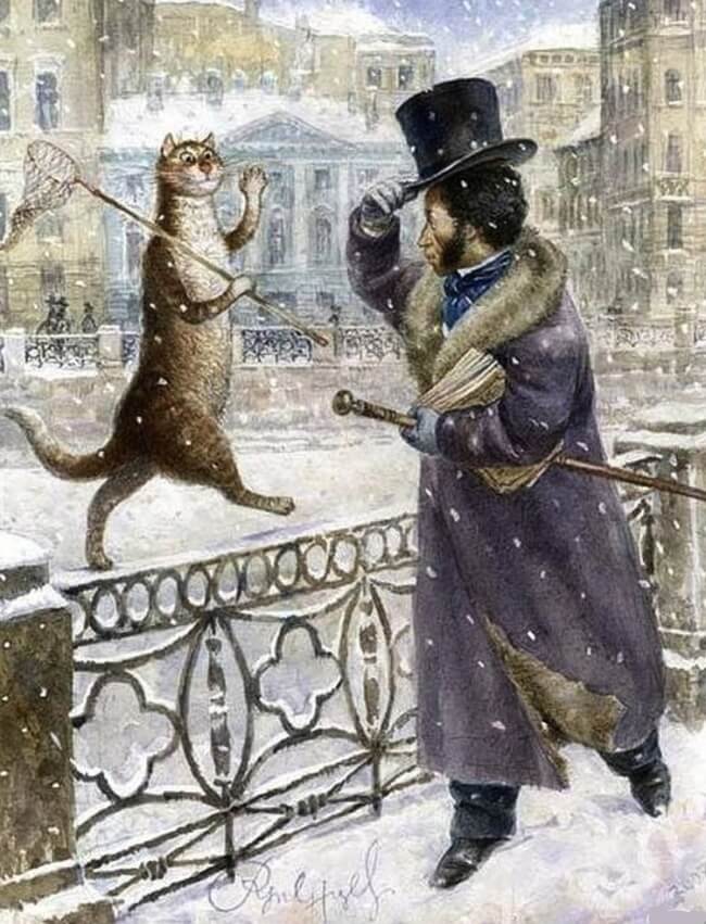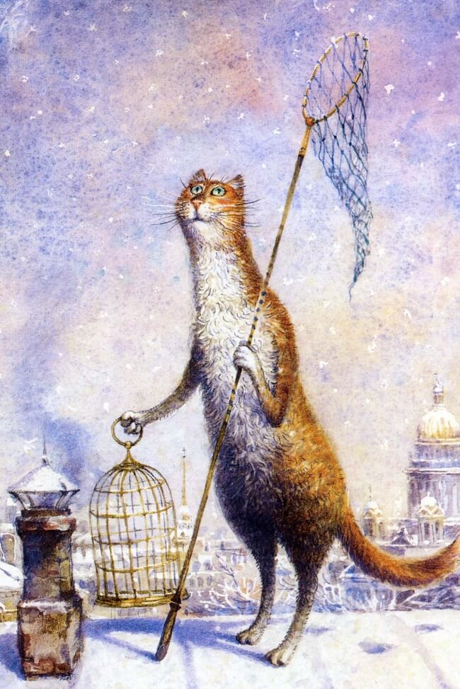 Картины, посвященные котам, полны доброго юмора и вкуса. Эти коты — не зря ведь они живут в культурной столице — забредают иногда на картины Брейгеля, пьют чай, словно кустодиевские купчихи, и дружны с Александром Сергеевичем Пушкиным. Петербург под добрым взглядом кошачьих глаз становится городом таинственным и сказочным: сфинксы оживают, и ангелы слетают с небес… Но и простые радости не чужды котам: они любят рыбалку и футбол.
