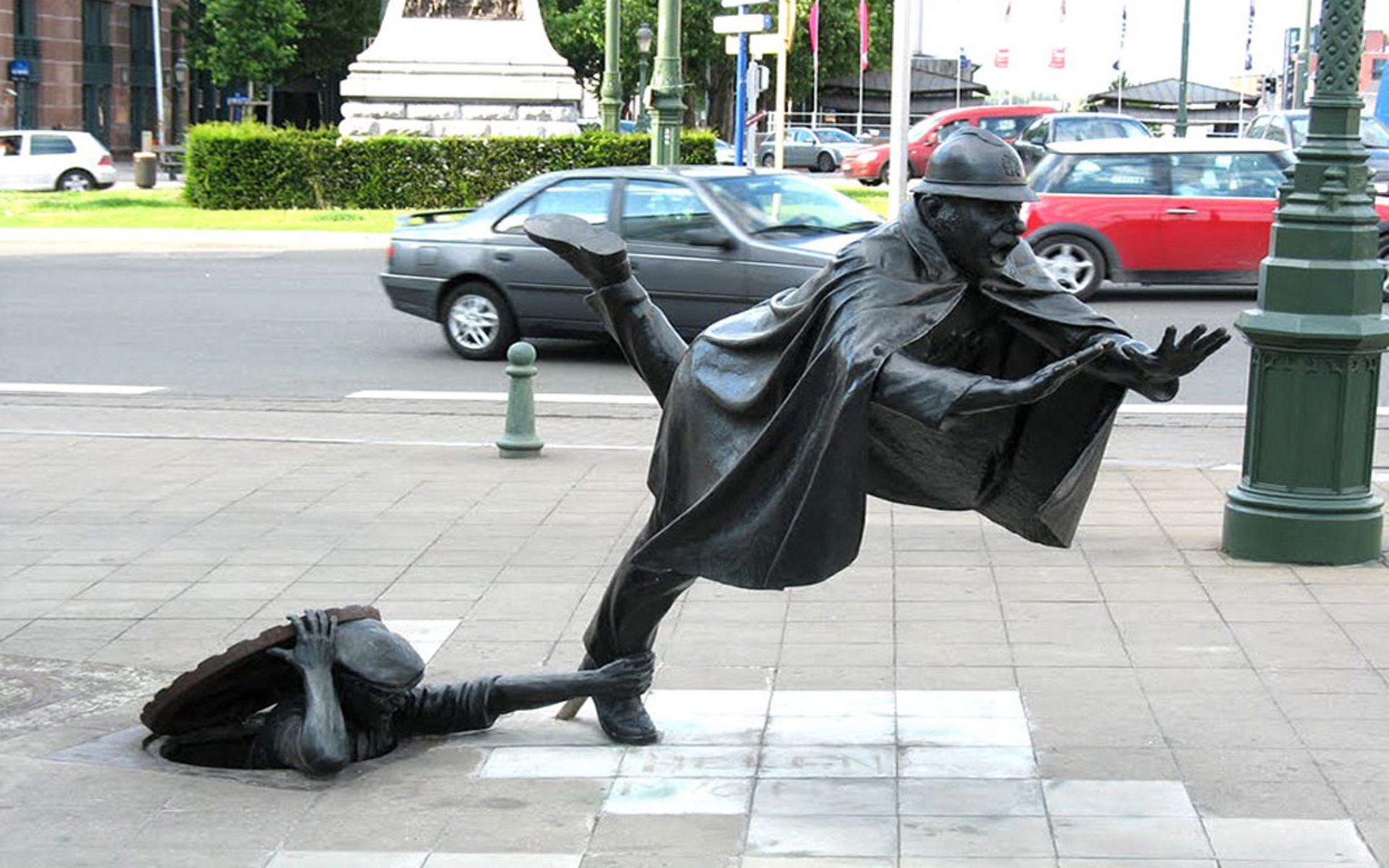 Памятник установлен в 1985 году на одной из улиц Брюсселя в районе Моленбик. Сюжет напоминает сцену из комикса: из канализационного люка неожиданно высовывается молодой шутник и сваливает полицейского с ног, хватая блюстителя порядка за ногу. Автор — бельгийский скульптор Том Францен.