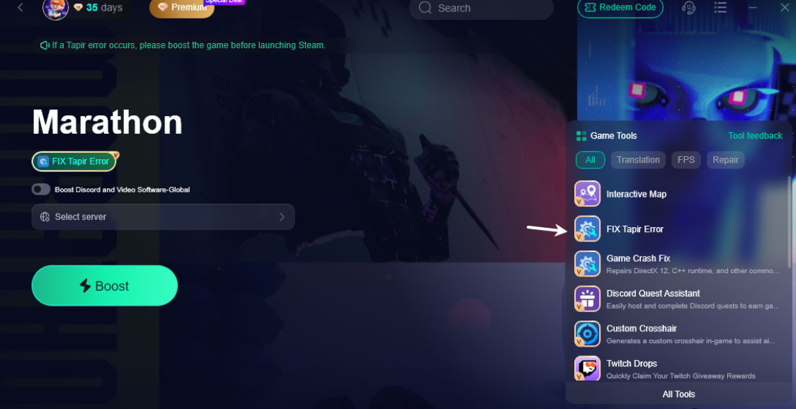 LagoFast предоставляет отдельный инструмент TAPIR Error Fix Tool для Marathon.