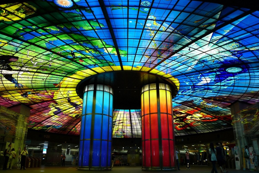 Эта великолепная станция метро в городе Гаосюн, открытая в сентябре 2008 года, является наиболее величественным сооружением из стекла в мире. «Dome of light» (Световой купол) итальянского художника Нарцисса Квольята состоит из 4500 стеклянных панелей. Этот свод показывает историю человеческой жизни через призму четырех элементов: Земля, Вода, Свет и Огонь.