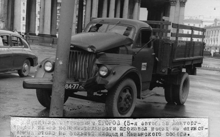 Грузовик наехал на единственный столб, расположенный на площади возле Казанского собора, 1956 г.