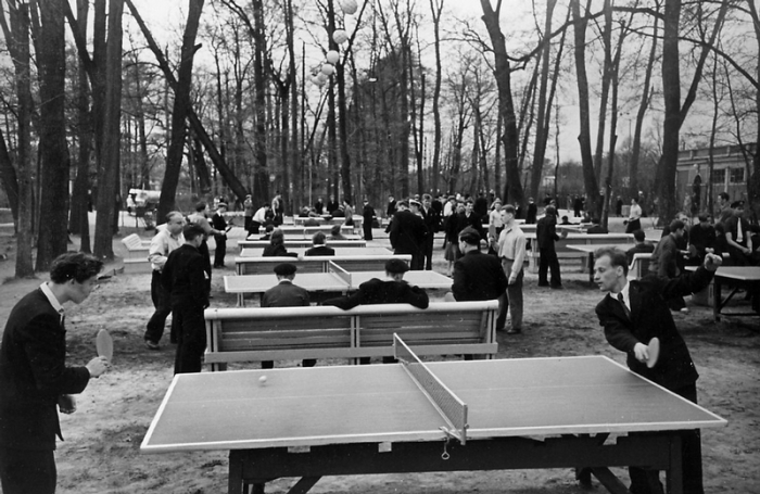 Мужчины играют в настольный теннис в парке, 1955 г.