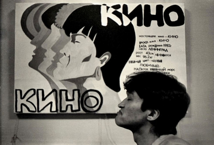 Виктор Цой в ленинградском рок-клубе возле афиши своей группы, 1986 г.