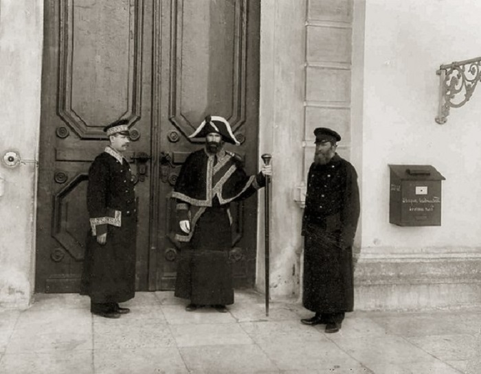 Лакеи возле главного входа в здание Фондовой биржи, 1903 г.