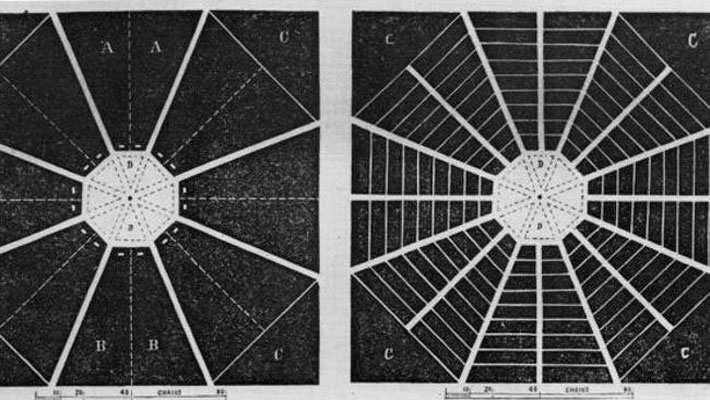 От центральной площади правильной восьмиугольной формы должны были расходиться 8 главных улиц, пространство между которыми заполнили бы дома, тоже восьмиугольники, и той же формы абмары и фермерские дворы. Восьмиугольная архитектура почему-то была популярна в Америке середины 19 века.