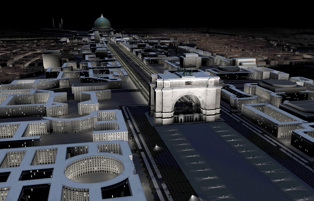 Он был бы напичкан монументами, прославляющими Третий рейх, и вообще стал бы образцом гигантомании с крупнейшим в мире Олимпийским стадионом и Триумфальной аркой по типу парижской, но намного больше. Прямо за ней располагалась бы аллея, «украшенная» рядами трофейных пушек.
