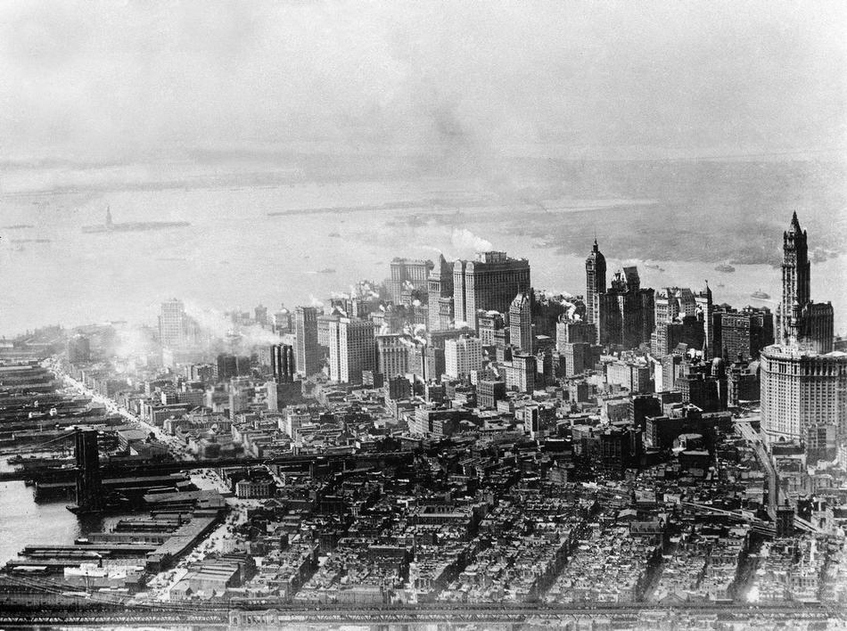 8. Вид Нижнего Манхэттена, Нью-Йорк, 1928 год. Справа видна башня Вулворта, в центре слева — статуя Свободы. Манхэттенский мост на переднем плане, Бруклинский — в центре фото.