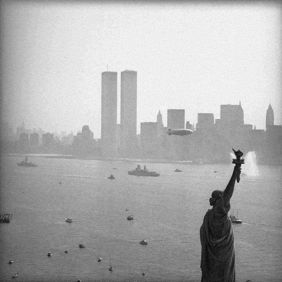 30. Боевые корабли проходят мимо статуи Свободы вверх по реке Гудзон для учений Operation Sail, 3 июля 1976 года. На горизонте — Манхэттен и башни-близнецы Всемирного торгового центра, справа виден шпиль Эмпайр-стейт-билдинг.