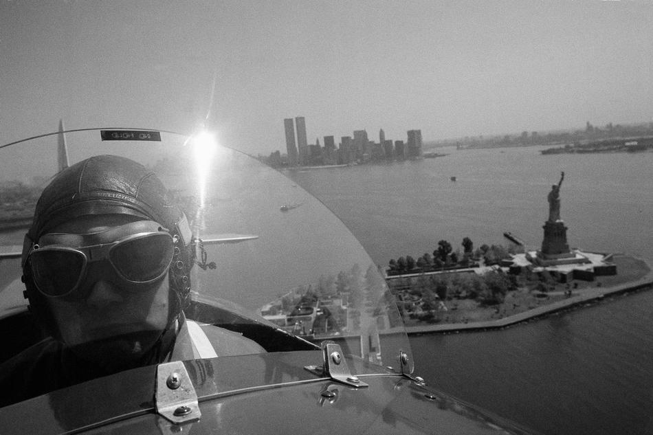 33. Капитан Бак Гилберт в кабине биплана 1929 года постройки над бухтой Нью-Йорка, 4 июня 1976 года. Гилберт, пилот самолета DC-8 компании United Airlines, восстановил биплан, который не поднимался в воздух 45 лет.