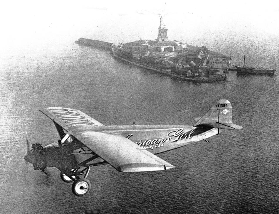 9. Американская актриса и летчица Рут Элдер, которая совершит попытку стать первой женщиной, перелетевшей из Нью-Йорка в Париж, пролетает мимо статуи Свободы на своем самолете American Girl, 4 октября 1927 года.