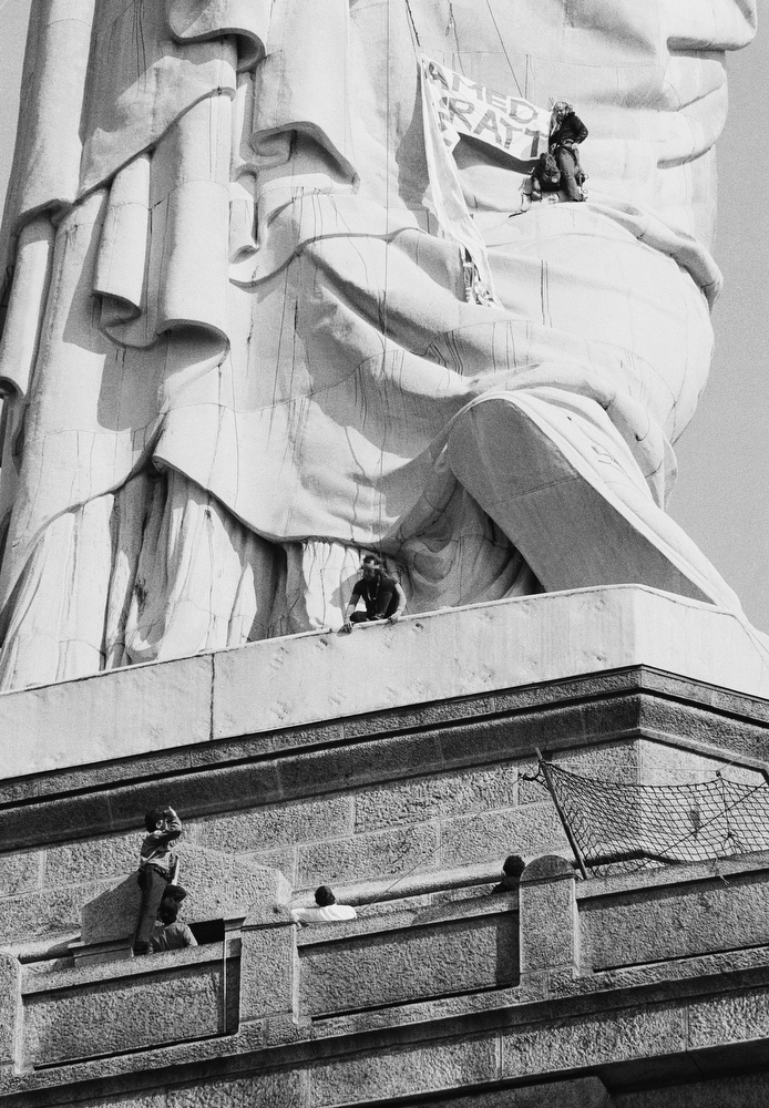 38. Полицейский на парапете (слева внизу) пытается уговорить людей наверху покинуть статую. 10 мая 1980 года демонстранты забрались на статую и закрепили на ней баннер с надписью «Свободу упрятали за решетку — освободите Джеронимо Пратта». Джеронимо Пратт отбывал срок за убийство школьного учителя в 1969 году.