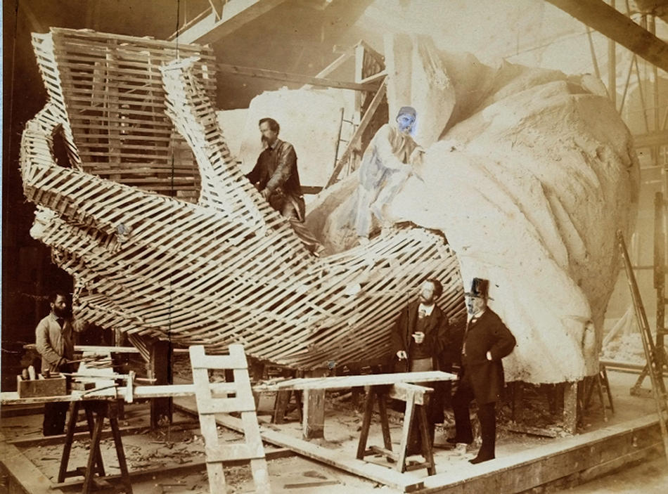 3. Фото из Библиотеки Конгресса США: рабочие в мастерской Бартольди в Париже собирают первую модель статуи, левую руку и голову в четверть размера. Зима 1882 года.