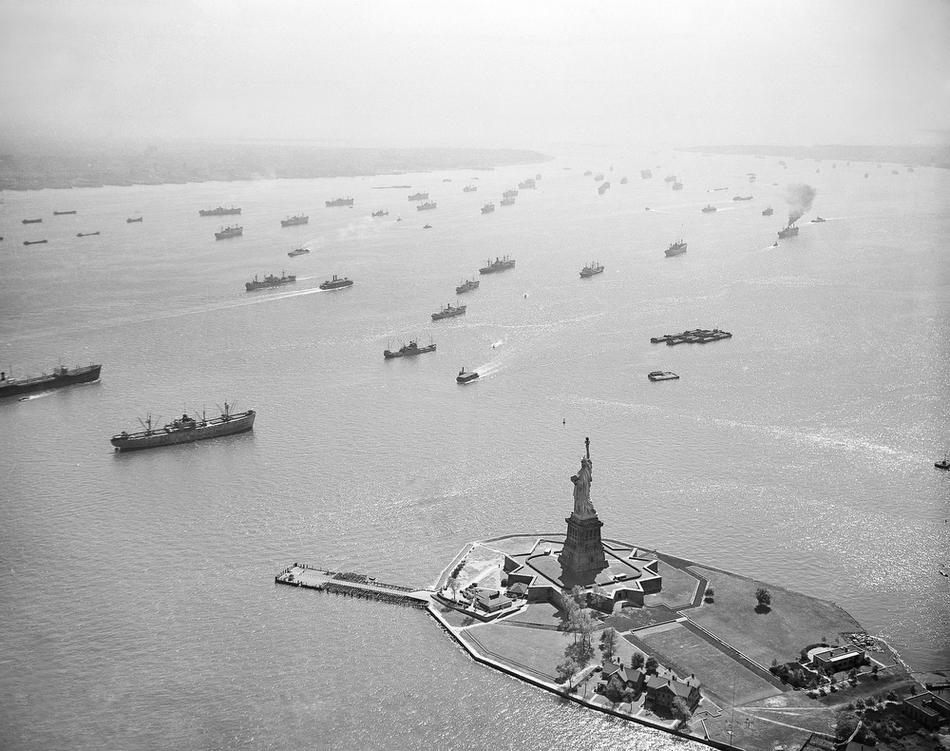 16. Торговые суда на якоре в гавани Нью-Йорка, 16 сентября 1946 года. Суда стоят на якоре из-за забастовки в порту. Движутся только несколько паромов и буксиров.